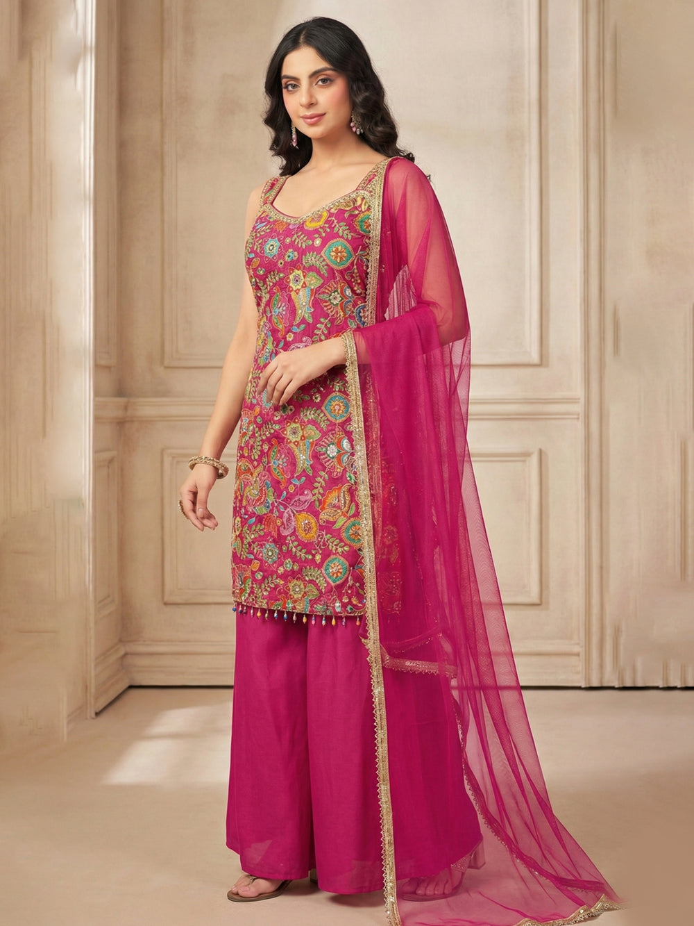 Jaipuri Blush Pink Embroidered Kurta Palazzo Set with Dupatta | Marriage and festive wear