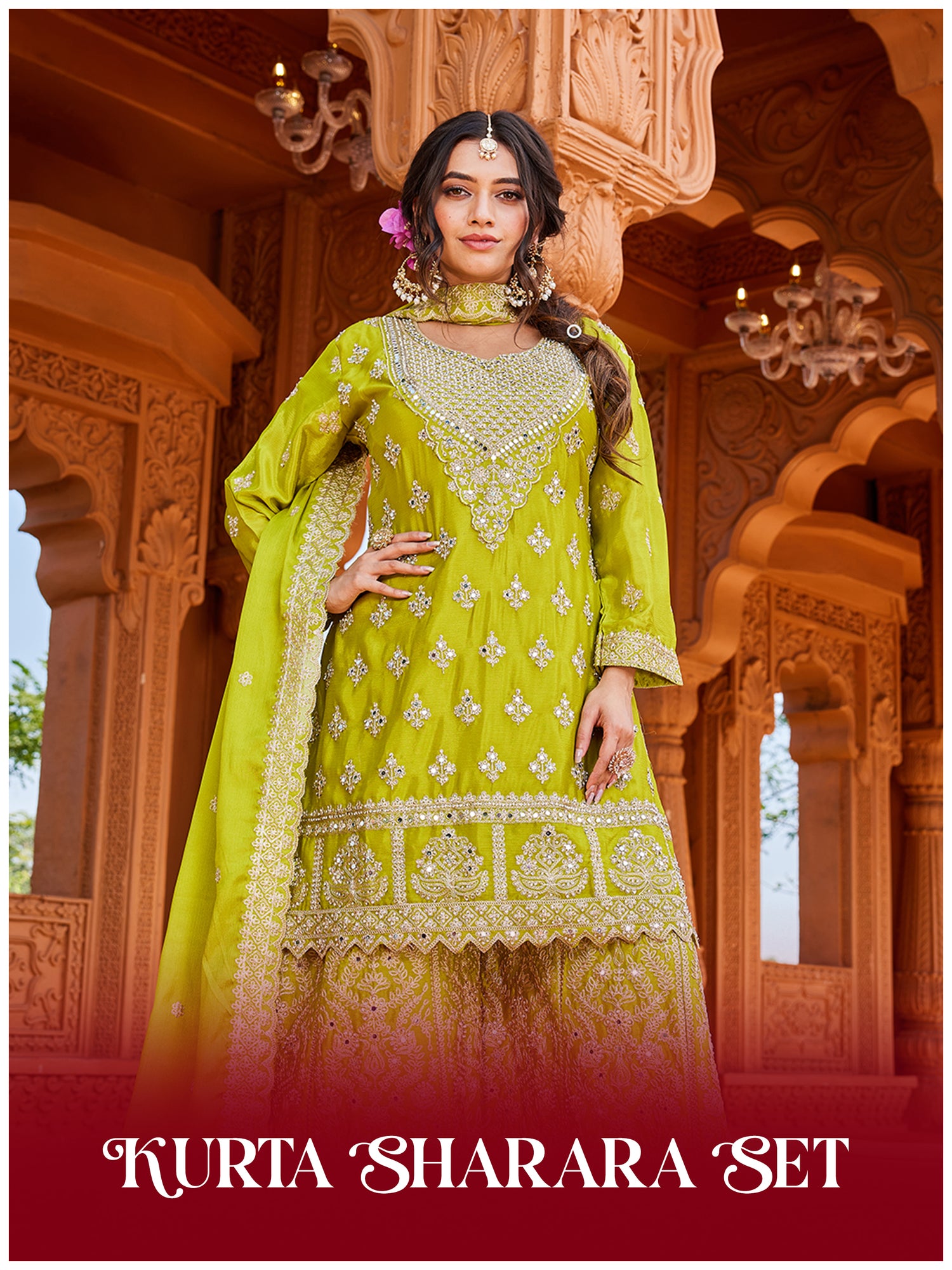 Olive Green Tissue Suit Set for Women | 3-Piece Kurta, Palazzo & Dupatta with Heavy Work | Festive & Wedding Wear