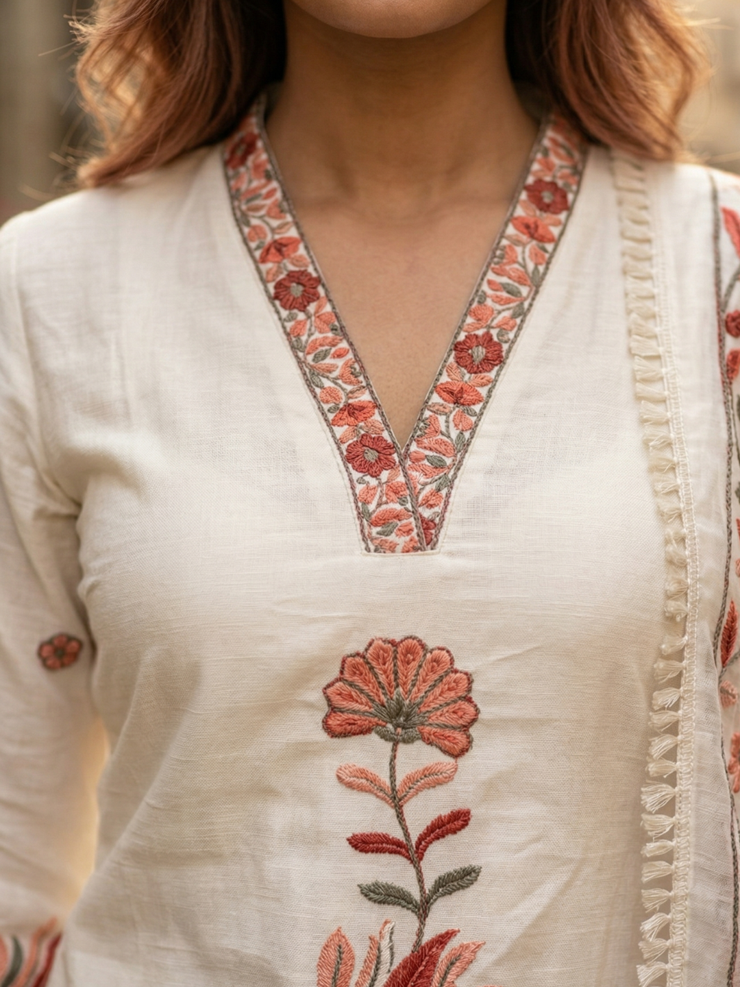 The straight-fit kurta features beautifully crafted floral embroidery in rich red and coral tones, flowing vertically across the front to create a flattering and elongating effect. The intricate threadwork adds depth and visual interest while maintaining a soft and elegant balance against the soothing ivory base. The neckline is detailed with fine embroidery, enhancing the overall sophistication of the outfit.
