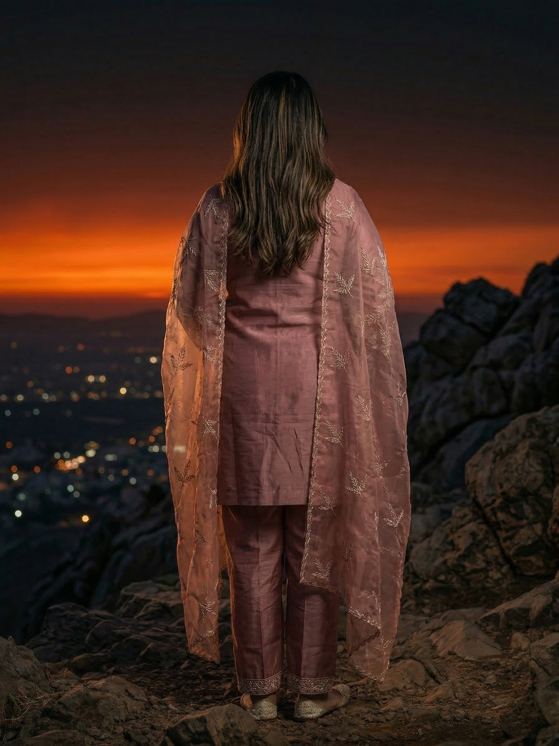 Make a bold yet elegant statement with this Mauve Wine Embroidered Kurta Pant Set, designed for women who love rich tones, intricate detailing, and refined ethnic silhouettes. This luxurious 3-piece ensemble is perfect for evening celebrations, wedding functions, and festive occasions where sophistication meets style.