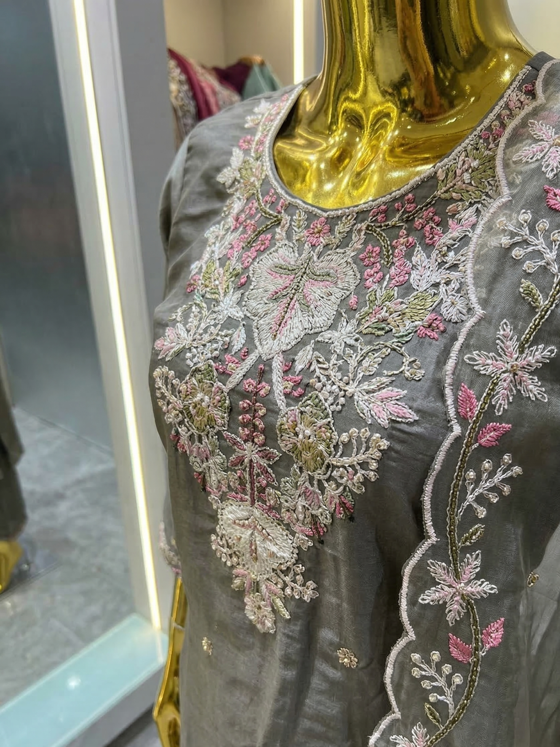 The matching straight pants provide a structured and polished look, ensuring comfort and ease throughout the day. Completing the ensemble is a sheer dupatta, detailed with a beautifully embroidered floral border and subtle motifs, adding flow, movement, and a soft feminine charm to the overall outfit.